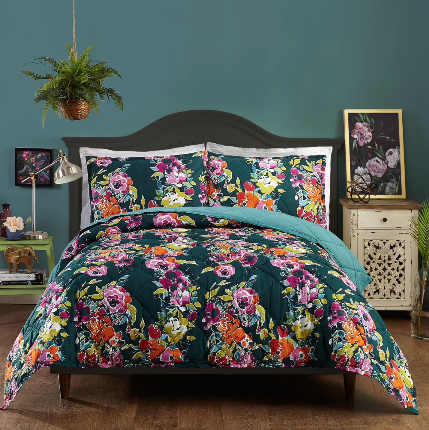 Over time I started to figure out the design of the room. I was inspired by the floral bedding in the photo below. Both of the rooms in the below photos, use bold bright colors, and I knew that was something I wanted to do in this space.